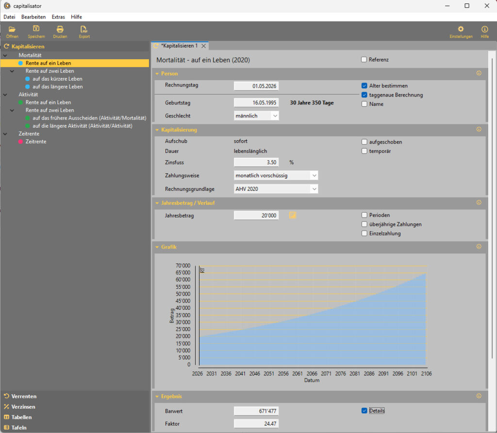 capitalisator.de ermöglicht eine taggenaue Kapitalisierung, die zudem mit beliebigen Zinsfüssen kombiniert werden kann und das Rechnen mit allen Sterbetafeln ab 2002 bis 2022 erlaubt. Darüber hinaus ermöglicht der neue capitalisator es dem Benutzer sogar, Tabellen selbst herzustellen und auszudrucken. Die Sterbetafeln werden jährlich aktualisiert, sobald neue Überlebensordnungen publiziert werden.